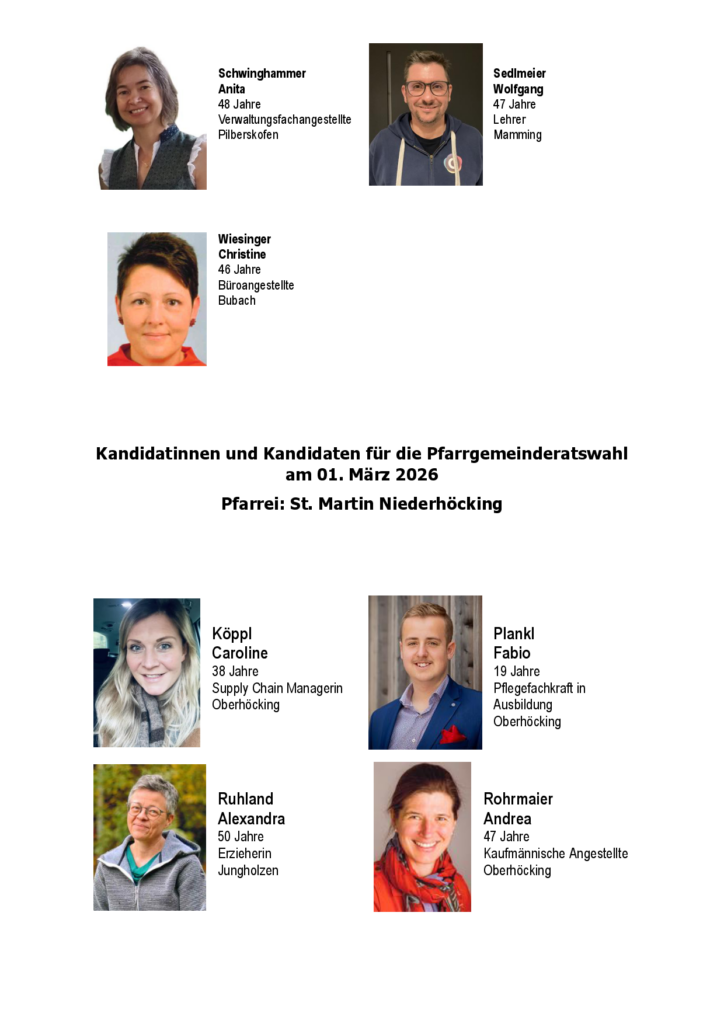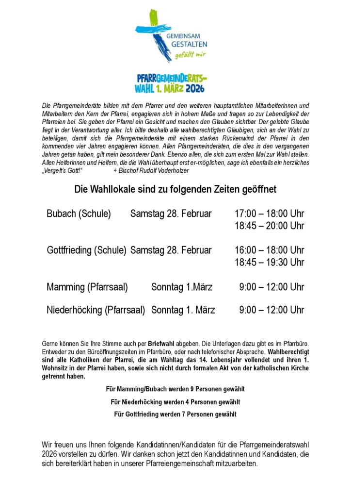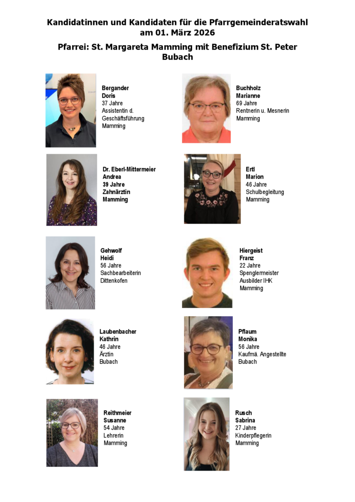 Die vielen Dienste in unserer Pfarreiengemeinschaft machen uns bewusst, dass die Kirche nicht nur ein Bauwerk zur gottesdienstlichen Versammlung braucht, sondern dass wir als Kirche ein Bauwerk aus lebendigen Steinen sind. Viele leisten in unseren Pfarrgemeinden Mamming und Niederhöcking dazu ihren wertvollen Beitrag. Vergelt’s Gott allen, die in unserer Pfarreiengemeinschaft zur Ehre Gottes und zum Wohl der Menschen in der Kirche Verantwortung übernehmen und sich engagieren.